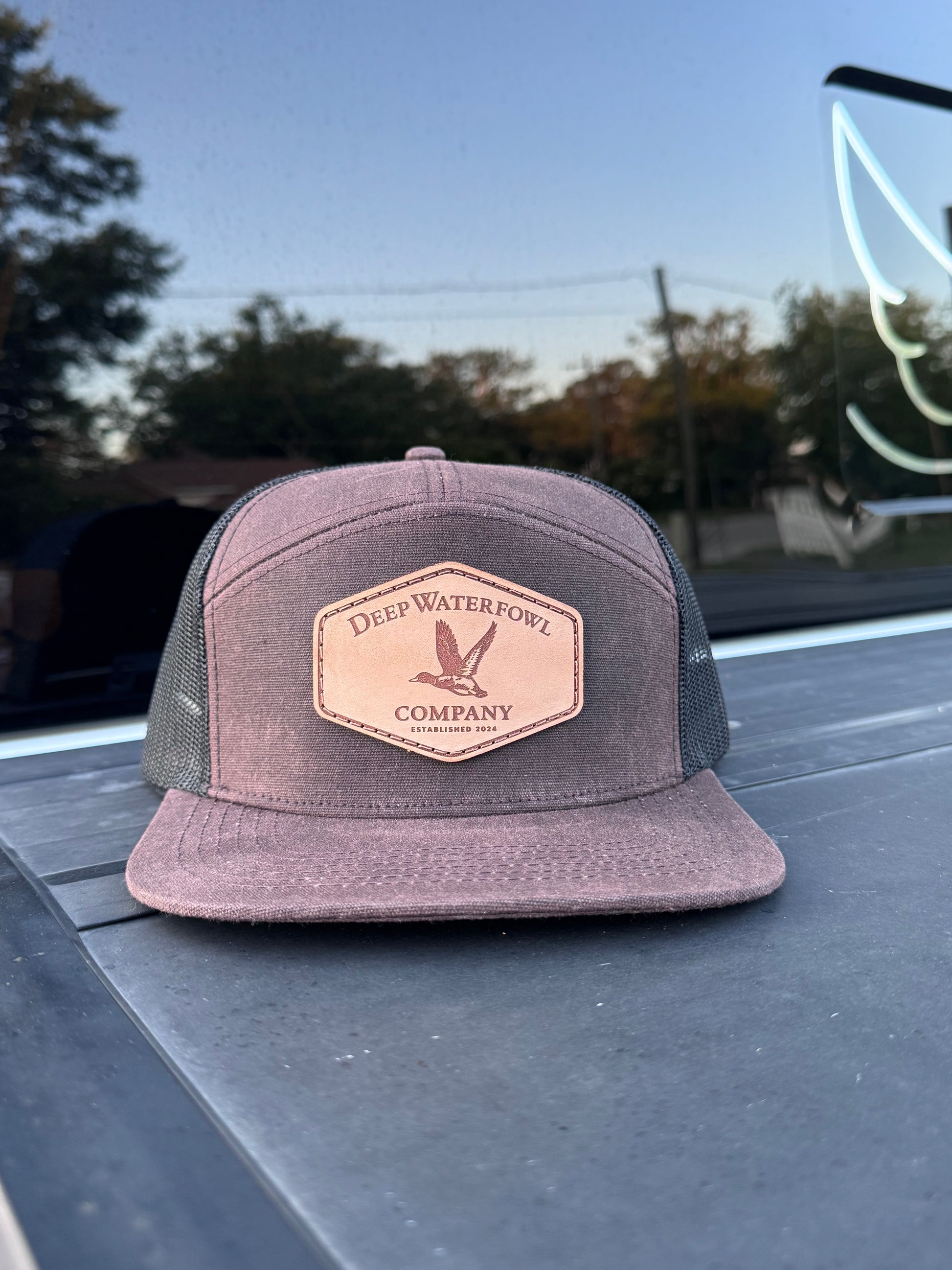 Introducing the new DWC Waxed | 7 Panel hat, crafted with deep waterfowl co's signature logo and adorned with a luxurious leather patch. Experience unbeatable style and quality in this must-have accessory. Upgrade your look with DWC Waxed | 7 Panel!